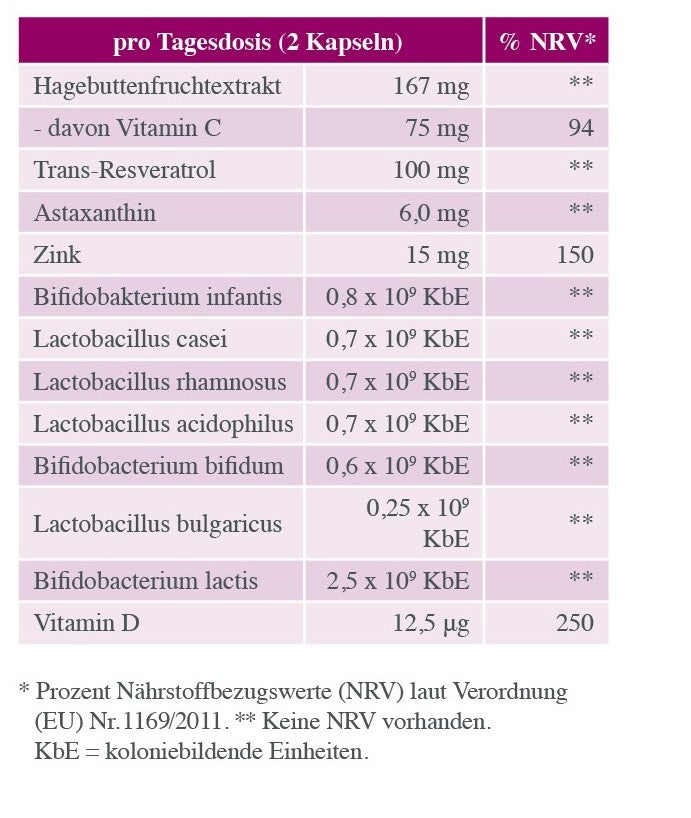 mit Bakterienstämmen, Hagebuttenfruchtextrakt, Trans-Resveratrol, Astaxanthin, Zink und Vitaminen.