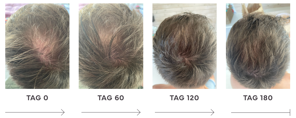Demgegenüber können bereits nach wenigen Wochen durch gezielte Unterstützung feine neue Härchen sichtbar werden, die im Laufe der Monate Schritt für Schritt die lichten Stellen verdichten und so das Haarbild nachhaltig verbessern.
