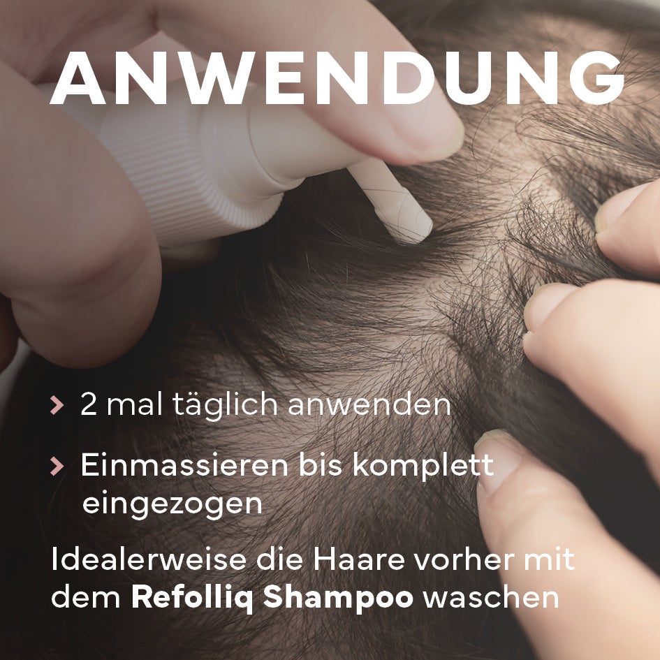 Zweimal täglich scheitelweise im Tonsur-Bereich auftragen und sanft einmassieren, bis alles eingezogen ist. Vorheriges Waschen mit dem Refolliq Tiefenreinigenden Haar- & Kopfhaut-Shampoo unterstützt die Aufnahme der aktiven Wirkstoffe.