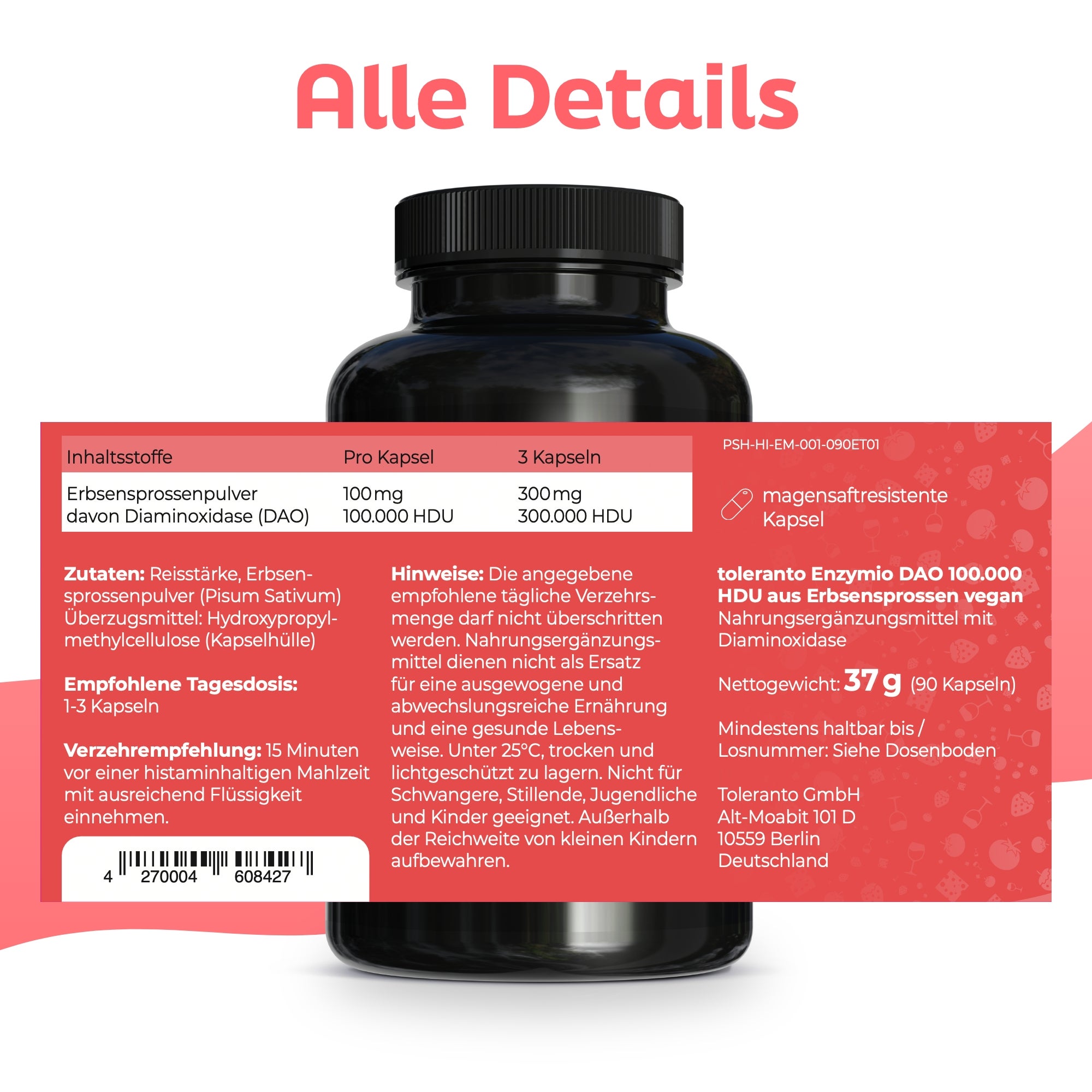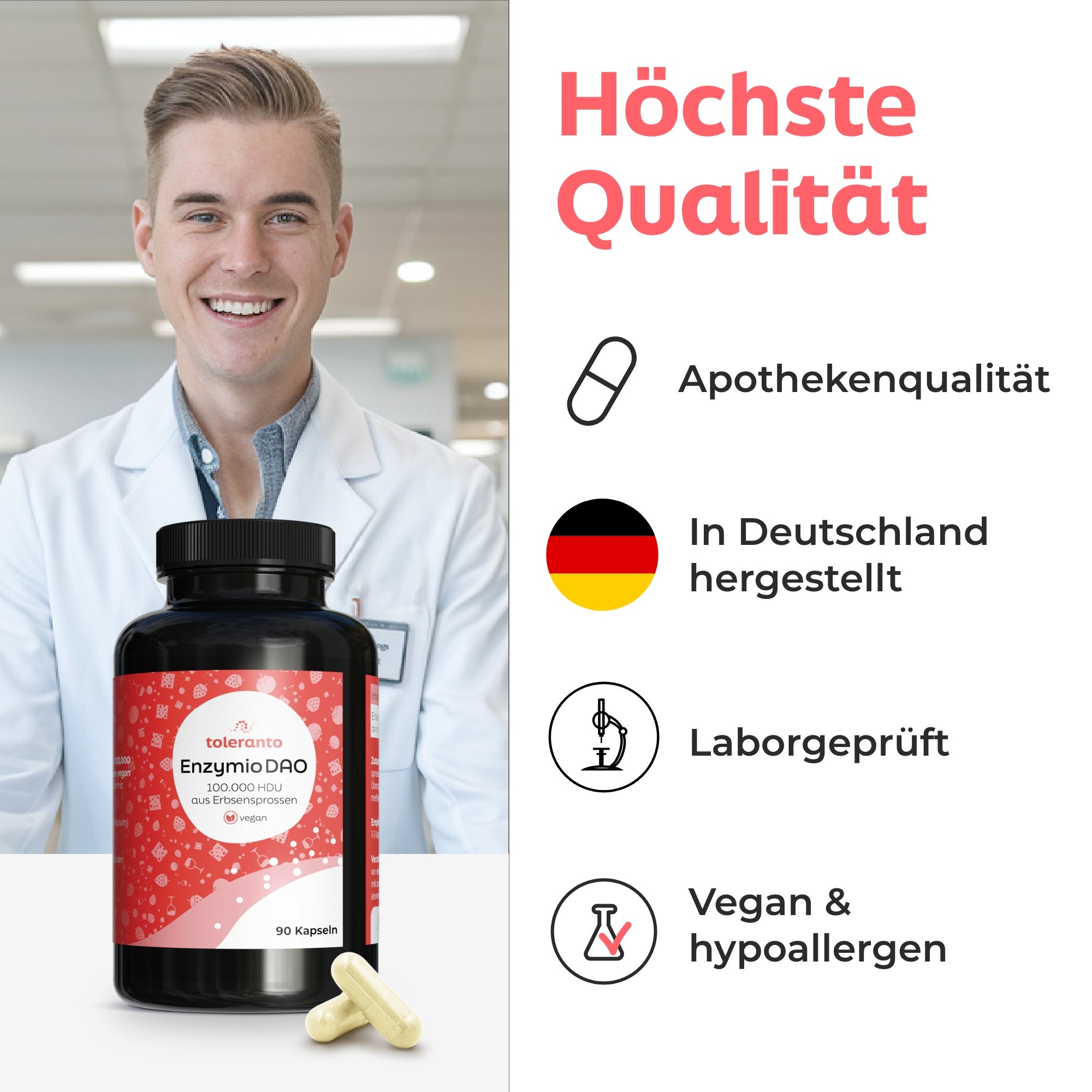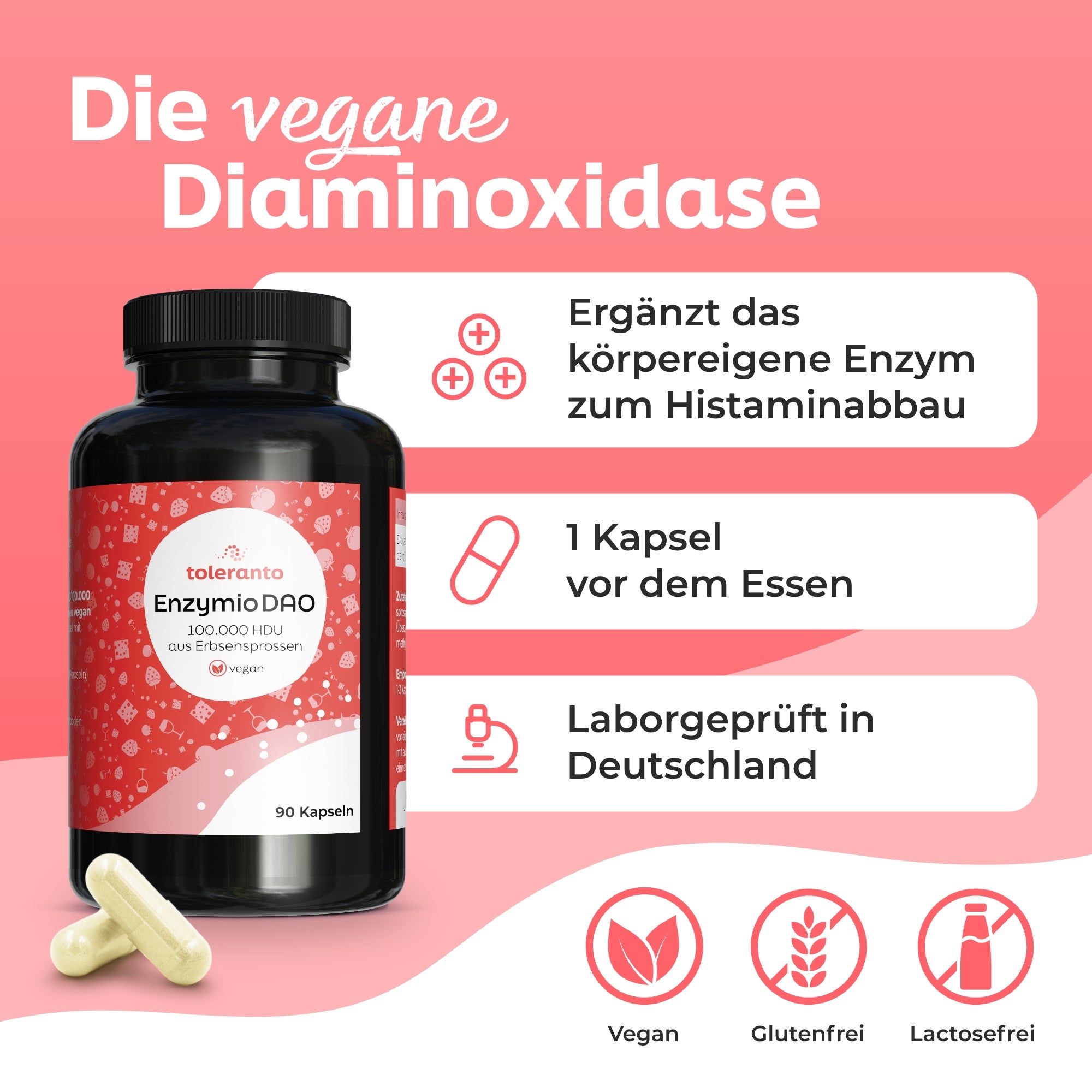 Enzymio DAO basiert auf einem patentierten Verfahren mit pflanzlicher DAO aus Erbsensprossen, ist vegan, frei von Zusatzstoffen und wird regelmäßig laborgeprüft.