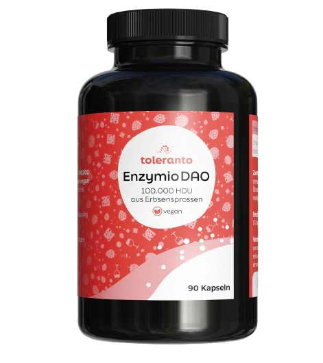 Enzymio DAO enthält Diaminoxidase (DAO) – ein Enzym, das im Dünndarm für den Abbau von Histamin verantwortlich ist. Histamin ist ein körpereigener Botenstoff, der in vielen Lebensmitteln vorkommt (z. B. in Käse, Rotwein, Tomaten, Schokolade, Wurstwaren). Bei gesunden Menschen wird überschüssiges Histamin nach dem Essen durch körpereigene DAO neutralisiert – bevor es ins Blut gelangt.
